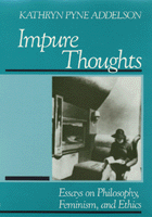 Impure Thoughts is divided into two parts: "Writing Philosophy" and "Writing Feminism." In the first section, she addresses such questions as how professional authority contributes to creating and maintaining hierarchies of class, gender, age, and race. With reference to various reproductive debates, Addelson takes issue with philosophers who "preempt our moral meanings and our solutions to our social problems" under the assumption that cognitive authority is neutral. Throughout these essays, she tries to demonstrate how philosophy might become more empirical.